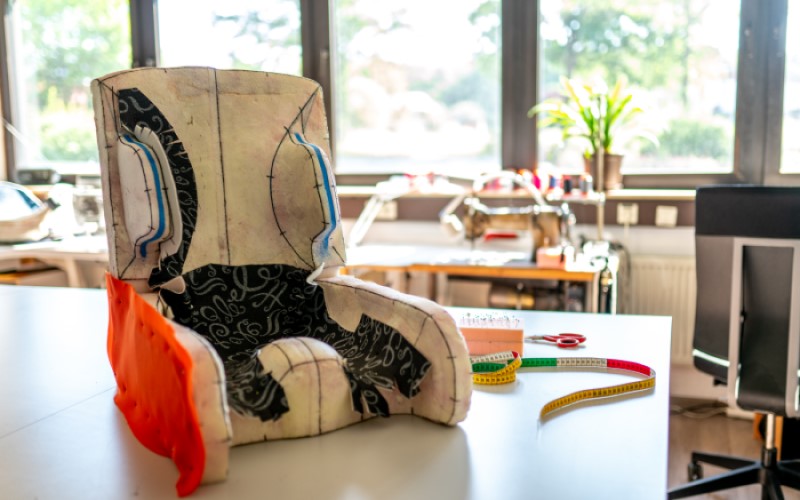 Sobald bei dem Kind (teilweise auch nach einer längeren Erprobungsphase) eine physiologische Sitzposition gesichert ist, kommt es zur Endfertigung. Hier wird die Sitzschale bezogen und der Alu Rohling beschichtet. Das Kind kann sich den gewünschten Stoff und die Farbe natürlich im Vorfeld selbst aussuchen.