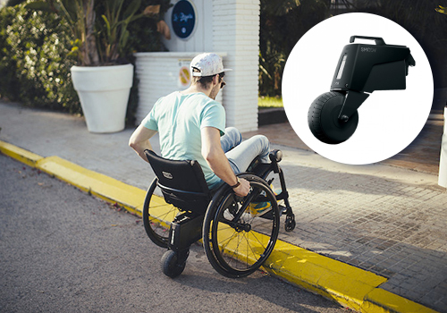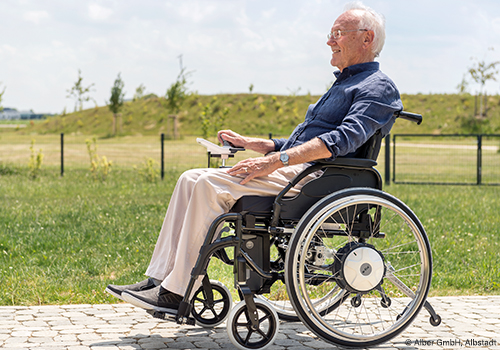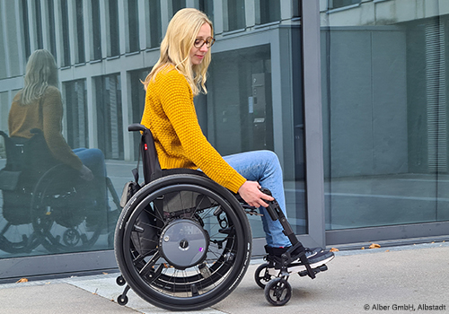 Dieser Antrieb verbindet aktive Mobilität mit therapeutischem Nutzen. Auch Rollstuhlfahrer mit eingeschränkter Kraft können sich hiermit leicht selbständig fortbewegen. Anwender bleiben somit in Bewegung und trainieren die Vitalfunktionen. Der integrierte, geräuscharme Elektromotor unterstützt wirkungsvoll die Anschubbewegung. Jeder Impuls am Greifreifen wird von der Sensorik erfasst und in eine passende Kraftunterstützung übersetzt. Mit dieser Extrakraft können auch längere Strecken, Rampen oder Steigungen selbständig bewältigt werden.